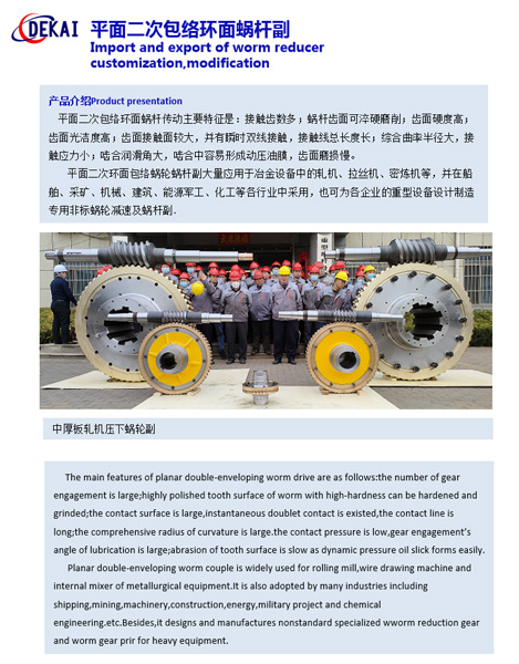 產(chǎn)品簡介:平面二次包絡(luò)環(huán)面蝸桿傳動于1971年發(fā)明的一種新型蝸桿傳動裝置,這種蝸桿副具有以下特點(diǎn):蝸桿齒面硬度高,表面經(jīng)滲碳后精確磨削而成,精度高,表面光滑。加工過程與成形原理吻合度高,傳動精度高。蝸桿與蝸輪的嚙合為多齒接觸,每齒為瞬時(shí)雙線接觸,齒面接觸區(qū)可達(dá)百分之七十以上。嚙合面的綜合曲率半徑大。接觸線與相對速度方向夾角大,動壓油膜形成及保持性好。此種蝸輪副承載能力大,傳動效率高,耐磨損,可廣泛地應(yīng)用與冶金,礦山,化工,建筑,橡塑,船舶等各種行業(yè)中。